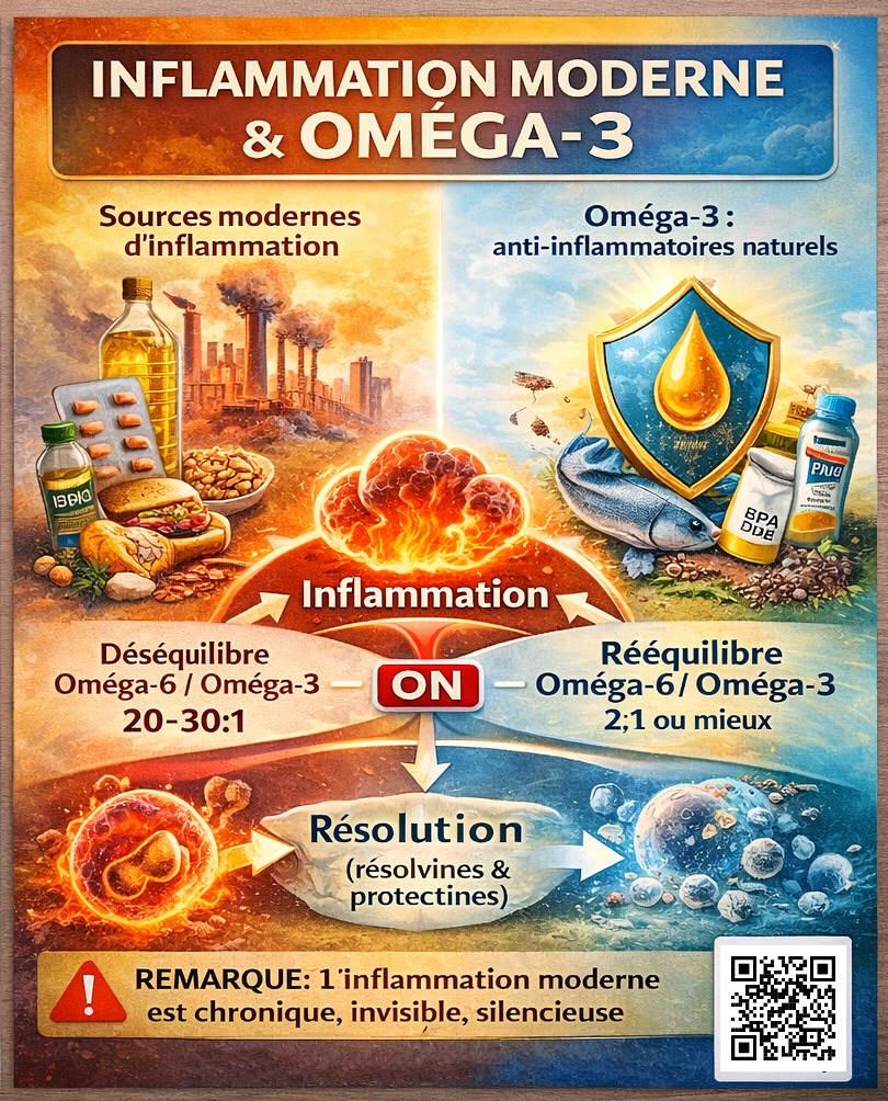 Ce document propose une analyse systémique et scientifique vulgarisée du lien entre expositions modernes, inflammation persistante, déséquilibres physiologiques et déficit en oméga-3, dans une optique de publication à forte valeur éducative.